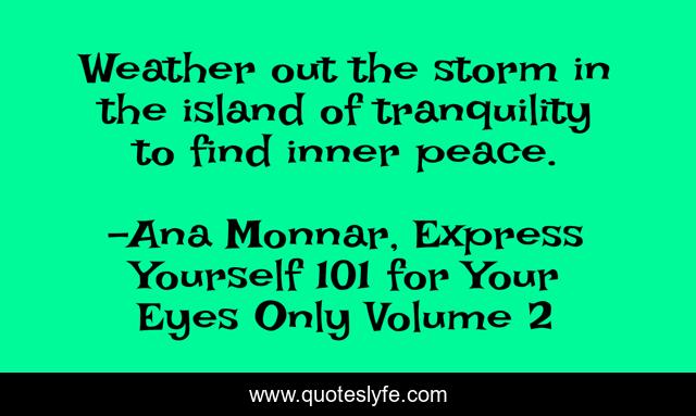 This page presents the quote "Weather out the storm in the island of tranquility to find inner peace.". Author of this quote is Ana Monnar, Express Yourself 101 for Your Eyes Only Volume 2. This quote is about tranquility, inner-peace,.