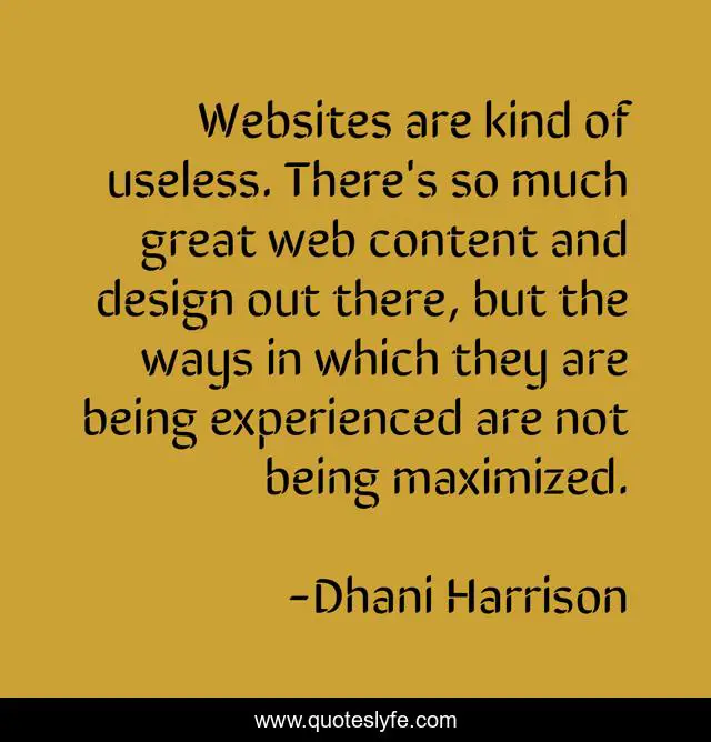 This page presents the quote "Websites are kind of useless. There's so much great web content and design out there, but the ways in which they are being experienced are not being maximized.". Author of this quote is Dhani Harrison. This quote is about content, great, kind,.