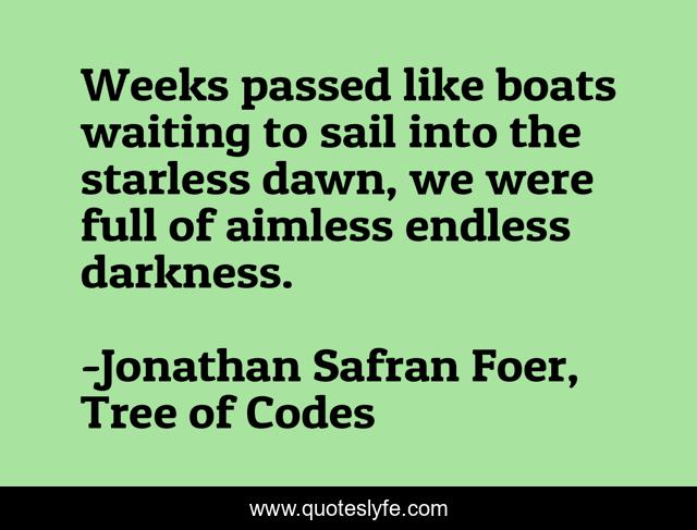 This page presents the quote "Weeks passed like boats waiting to sail into the starless dawn, we were full of aimless endless darkness.". Author of this quote is Jonathan Safran Foer, Tree of Codes. .
