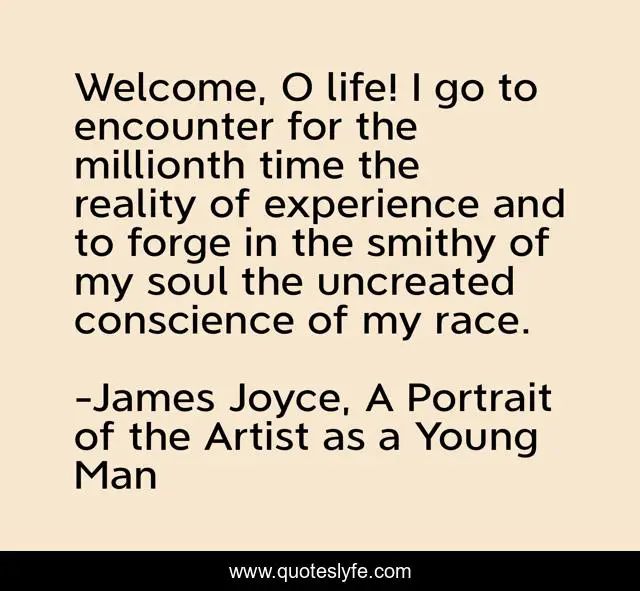 "James Joyce, A Portrait of the Artist as a Young Man Quotes." Quoteslyfe.com, 2025. Sat. 06 Dec. 2025. <https://www.quoteslyfe.com/quote/Welcome-O-life-I-go-to-encounter-158493>.