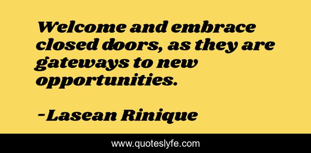 This page presents the quote "Welcome and embrace closed doors, as they are gateways to new opportunities.". Author of this quote is Lasean Rinique. This quote is about how-about-a-lifestyle-change, lasean-shelton, lasean-rinique, improvement,.