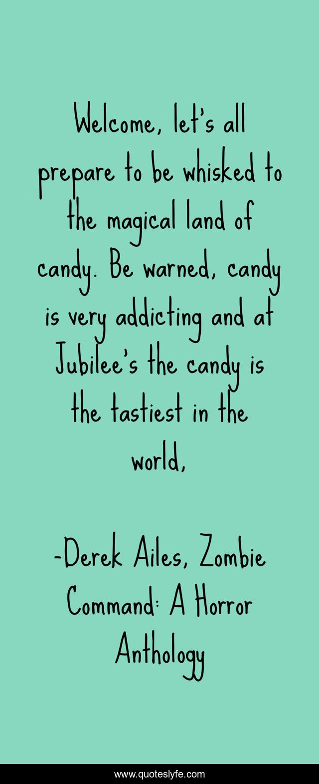 This page presents the quote "Welcome, let’s all prepare to be whisked to the magical land of candy. Be warned, candy is very addicting and at Jubilee’s the candy is the tastiest in the world, ". Author of this quote is Derek Ailes, Zombie Command: A Horror Anthology. This quote is about horror, willy-wonka, candy,.