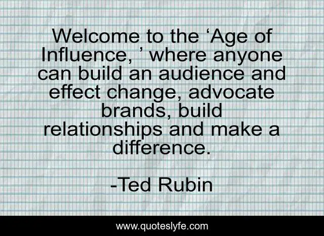This page presents the quote "Welcome to the ‘Age of Influence, ’ where anyone can build an audience and effect change, advocate brands, build relationships and make a difference.". Author of this quote is Ted Rubin. .