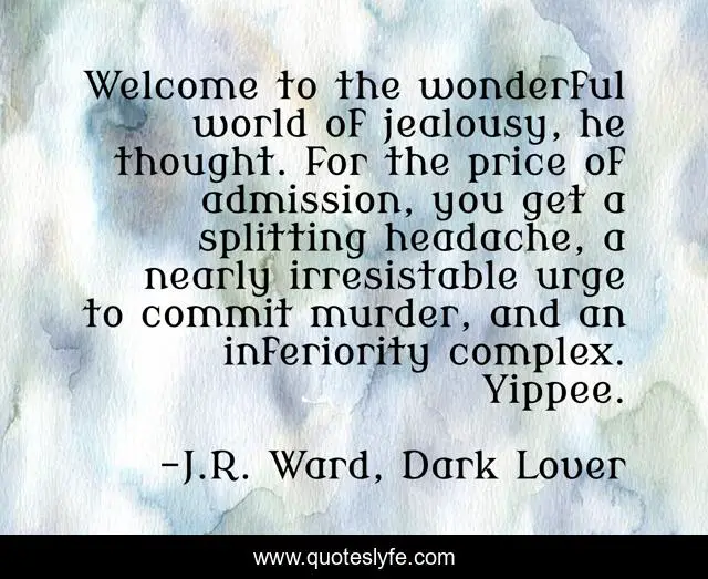 This page presents the quote "Welcome to the wonderful world of jealousy, he thought. For the price of admission, you get a splitting headache, a nearly irresistable urge to commit murder, and an inferiority complex. Yippee.". Author of this quote is J.R. Ward, Dark Lover. This quote is about humor, love, jealousy, affection,.