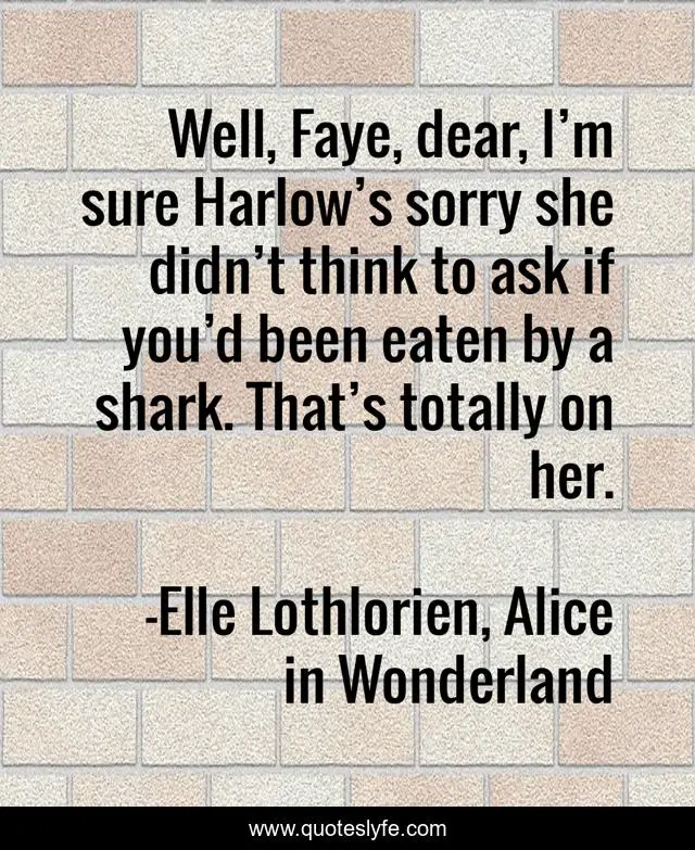 This page presents the quote "Well, Faye, dear, I’m sure Harlow’s sorry she didn’t think to ask if you’d been eaten by a shark. That’s totally on her.". Author of this quote is Elle Lothlorien, Alice in Wonderland. .