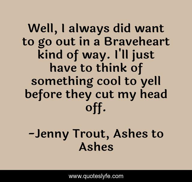 This page presents the quote "Well, I always did want to go out in a Braveheart kind of way. I'll just have to think of something cool to yell before they cut my head off.". Author of this quote is Jenny Trout, Ashes to Ashes. This quote is about death, humor,.