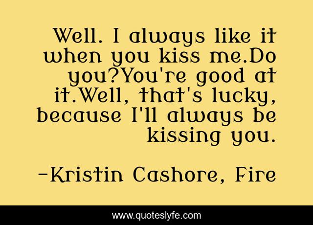 This page presents the quote "Well. I always like it when you kiss me.Do you?You're good at it.Well, that's lucky, because I'll always be kissing you.". Author of this quote is Kristin Cashore, Fire. This quote is about fire, brigan,.