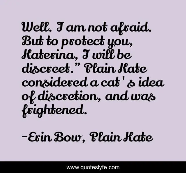This page presents the quote "Well. I am not afraid. But to protect you, Katerina, I will be discreet." Plain Kate considered a cat's idea of discretion, and was frightened.". Author of this quote is Erin Bow, Plain Kate. This quote is about cats, cat-humor,.