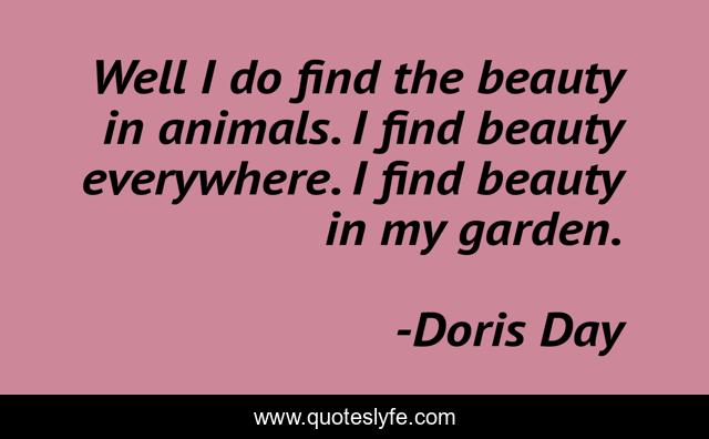 This page presents the quote "Well I do find the beauty in animals. I find beauty everywhere. I find beauty in my garden.". Author of this quote is Doris Day. This quote is about animals, garden, beauty,.
