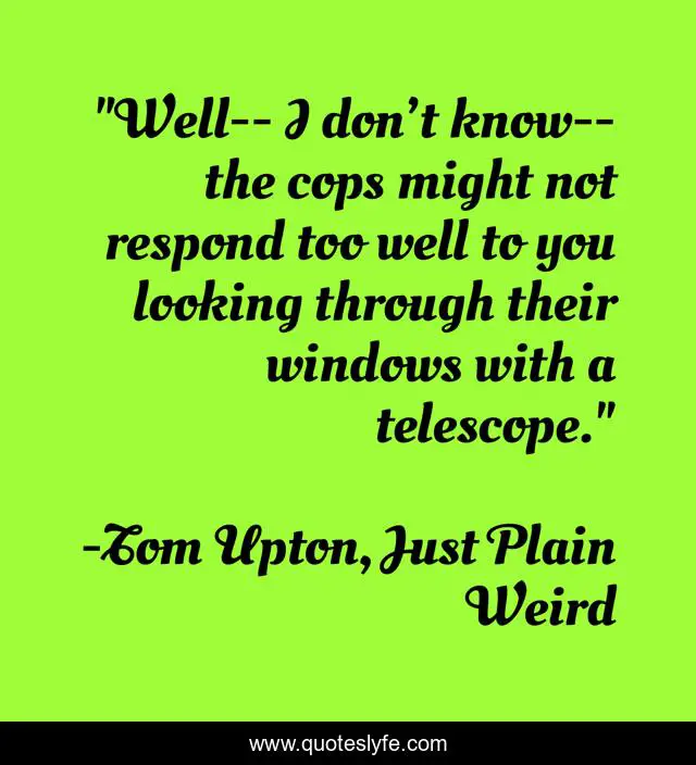 This page presents the quote ""Well-- I don’t know-- the cops might not respond too well to you looking through their windows with a telescope."". Author of this quote is Tom Upton, Just Plain Weird. This quote is about humor, young-adult,.