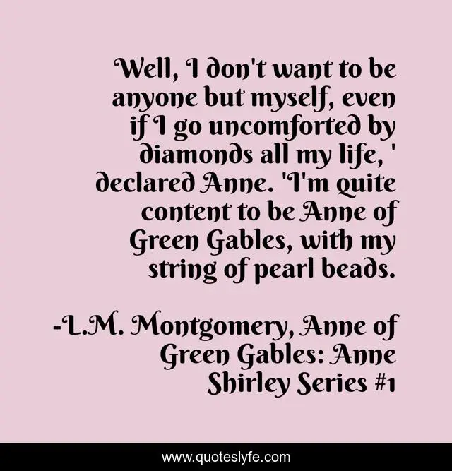 This page presents the quote "Well, I don't want to be anyone but myself, even if I go uncomforted by diamonds all my life, ' declared Anne. 'I'm quite content to be Anne of Green Gables, with my string of pearl beads.". Author of this quote is L.M. Montgomery, Anne of Green Gables: Anne Shirley Series #1. This quote is about life, diamond, satisfied, content, be-youself, happiness, happy,.
