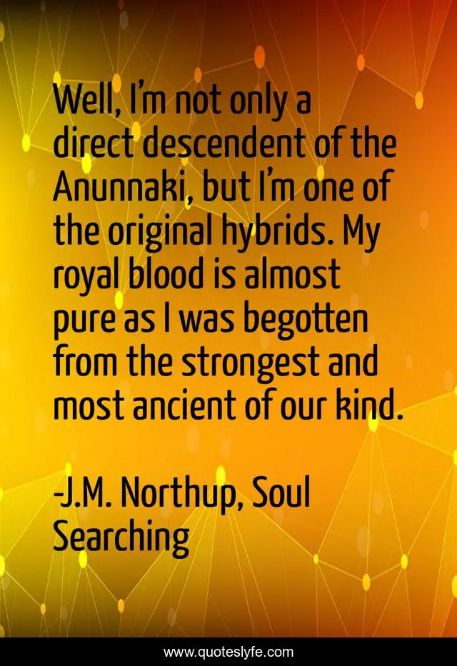 This page presents the quote "Well, I’m not only a direct descendent of the Anunnaki, but I’m one of the original hybrids. My royal blood is almost pure as I was begotten from the strongest and most ancient of our kind.". Author of this quote is J.M. Northup, Soul Searching. This quote is about erotic-romance, paranormal-romance, ancient-legends, anunnaki,.