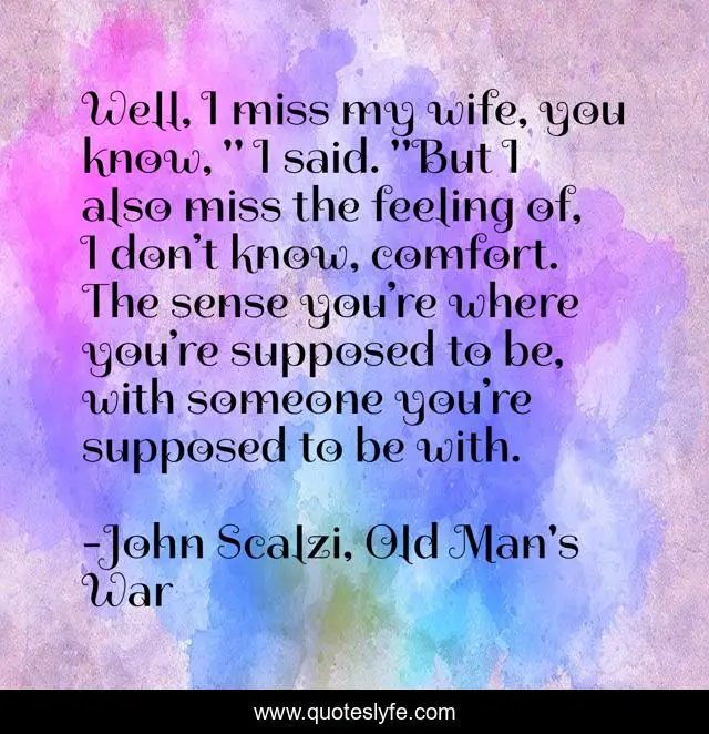This page presents the quote "Well, I miss my wife, you know, " I said. "But I also miss the feeling of, I don’t know, comfort. The sense you’re where you’re supposed to be, with someone you’re supposed to be with.". Author of this quote is John Scalzi, Old Man's War. This quote is about someone, wife, miss, comfort, supposed, sense, feeling, with,.