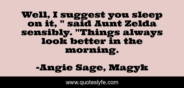 This page presents the quote "Well, I suggest you sleep on it, " said Aunt Zelda sensibly. "Things always look better in the morning.". Author of this quote is Angie Sage, Magyk. This quote is about sleep, hope, morning,.