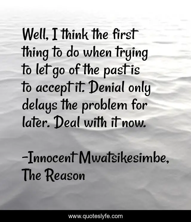 This page presents the quote "Well, I think the first thing to do when trying to let go of the past is to accept it. Denial only delays the problem for later. Deal with it now.". Author of this quote is Innocent Mwatsikesimbe, The Reason. This quote is about relationships, life, love, letting-go, acceptance, past, moving-on, affection,.