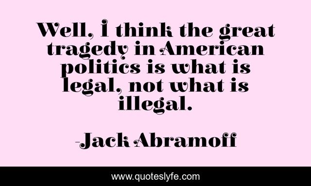 This page presents the quote "Well, I think the great tragedy in American politics is what is legal, not what is illegal.". Author of this quote is Jack Abramoff. This quote is about politics, great, tragedy,.