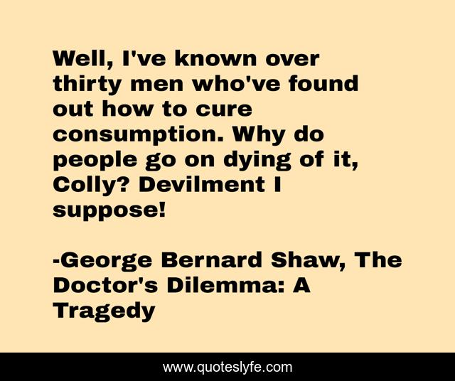 This page presents the quote "Well, I've known over thirty men who've found out how to cure consumption. Why do people go on dying of it, Colly? Devilment I suppose!". Author of this quote is George Bernard Shaw, The Doctor's Dilemma: A Tragedy. This quote is about consumption, science, cure, quackery, doctors, medicine,.