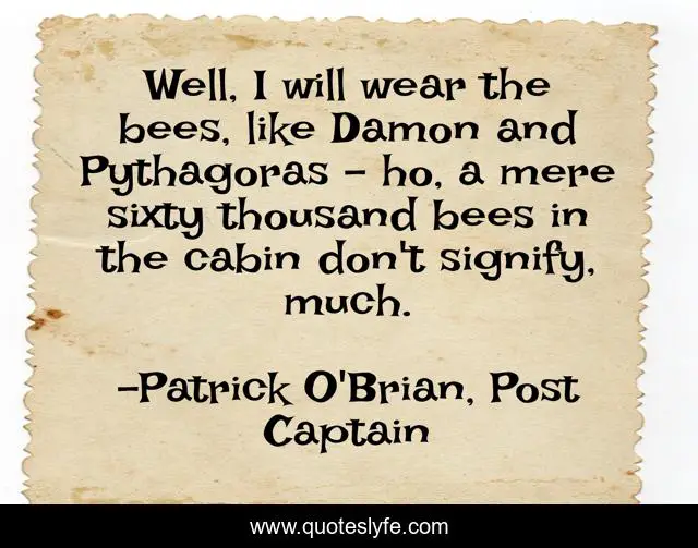 This page presents the quote "Well, I will wear the bees, like Damon and Pythagoras – ho, a mere sixty thousand bees in the cabin don't signify, much.". Author of this quote is Patrick O'Brian, Post Captain. This quote is about friends, bees, friendship, jack-aubrey,.