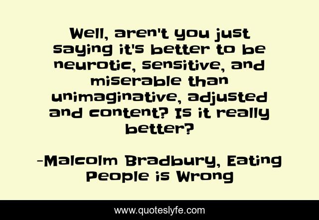 This page presents the quote "Well, aren't you just saying it's better to be neurotic, sensitive, and miserable than unimaginative, adjusted and content? Is it really better?". Author of this quote is Malcolm Bradbury, Eating People is Wrong. This quote is about unimaginative, philosophy-of-existence, life, quotable, neurosis, sensitive, contentment, misery,.