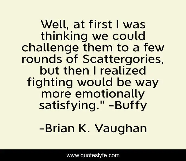 This page presents the quote "Well, at first I was thinking we could challenge them to a few rounds of Scattergories, but then I realized fighting would be way more emotionally satisfying." -Buffy". Author of this quote is Brian K. Vaughan. This quote is about humor, buffy-the-vampire-slayer, fighting,.
