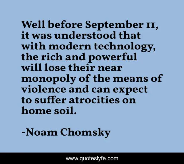 This page presents the quote "Well before September 11, it was understood that with modern technology, the rich and powerful will lose their near monopoly of the means of violence and can expect to suffer atrocities on home soil.". Author of this quote is Noam Chomsky. This quote is about home, violence, powerful,.