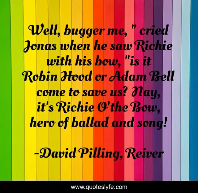 This page presents the quote "Well, bugger me, " cried Jonas when he saw Richie with his bow, "is it Robin Hood or Adam Bell come to save us? Nay, it's Richie O'the Bow, hero of ballad and song!". Author of this quote is David Pilling, Reiver. .