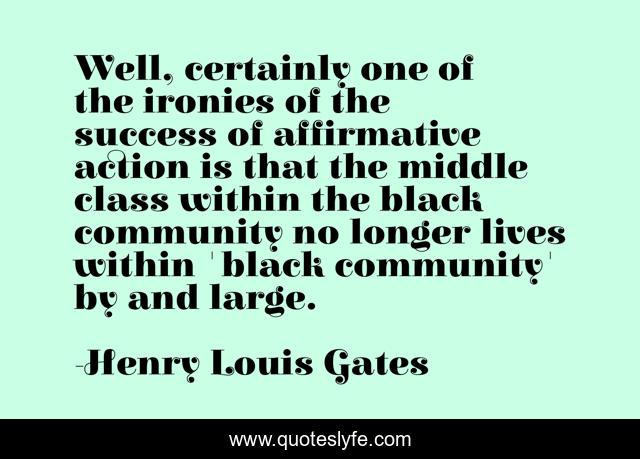 This page presents the quote "Well, certainly one of the ironies of the success of affirmative action is that the middle class within the black community no longer lives within 'black community' by and large.". Author of this quote is Henry Louis Gates. This quote is about action, black, community,.