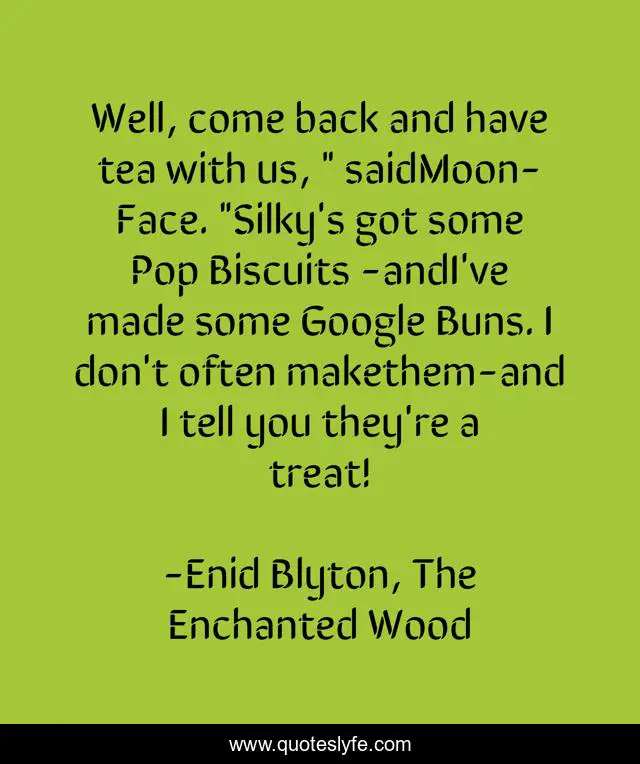 This page presents the quote "Well, come back and have tea with us, " saidMoon-Face. "Silky's got some Pop Biscuits -andI've made some Google Buns. I don't often makethem-and I tell you they're a treat!". Author of this quote is Enid Blyton, The Enchanted Wood. This quote is about fantasy, humor, fiction,.