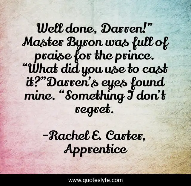 This page presents the quote "Well done, Darren!” Master Byron was full of praise for the prince. “What did you use to cast it?”Darren’s eyes found mine. “Something I don’t regret.". Author of this quote is Rachel E. Carter, Apprentice. This quote is about magic, ryiah, darren, romance, fantasy, young-adult, prince,.