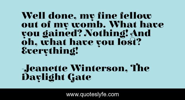 This page presents the quote "Well done, my fine fellow out of my womb. What have you gained? Nothing! And oh, what have you lost? Everything!". Author of this quote is Jeanette Winterson, The Daylight Gate. .