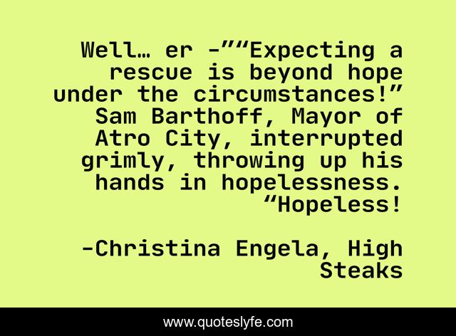 This page presents the quote "Well… er -”“Expecting a rescue is beyond hope under the circumstances!” Sam Barthoff, Mayor of Atro City, interrupted grimly, throwing up his hands in hopelessness. “Hopeless!". Author of this quote is Christina Engela, High Steaks. This quote is about city, throwing, of, barthoff, mayor, expecting, under, the, grimly,.