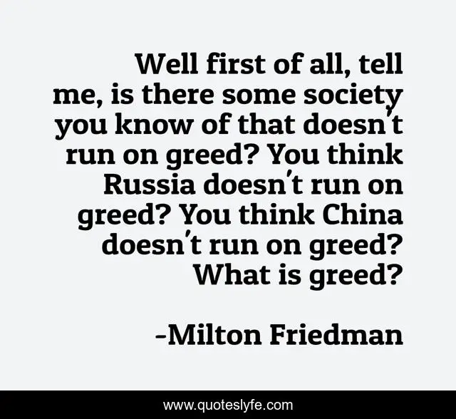 This page presents the quote "Well first of all, tell me, is there some society you know of that doesn't run on greed? You think Russia doesn't run on greed? You think China doesn't run on greed? What is greed?". Author of this quote is Milton Friedman. This quote is about me, greed,.