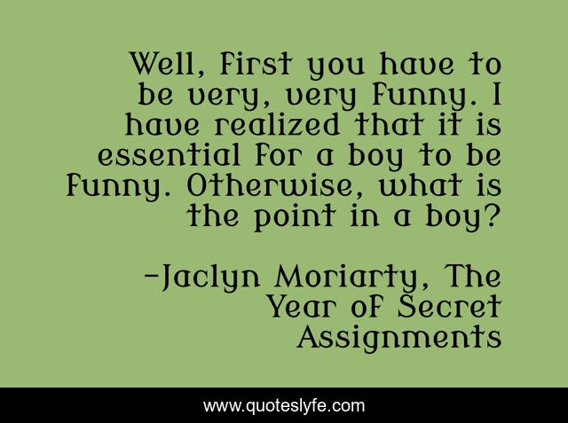This page presents the quote "Well, first you have to be very, very funny. I have realized that it is essential for a boy to be funny. Otherwise, what is the point in a boy?". Author of this quote is Jaclyn Moriarty, The Year of Secret Assignments. This quote is about boys, comedy, funny,.