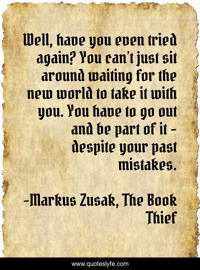 This page presents the quote "Well, have you even tried again? You can’t just sit around waiting for the new world to take it with you. You have to go out and be part of it - despite your past mistakes.". Author of this quote is Markus Zusak, The Book Thief. This quote is about life, life-lesson, try-again, new-world, failure, world, mistake,.