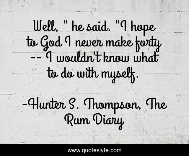 This page presents the quote "Well, " he said. "I hope to God I never make forty -- I wouldn't know what to do with myself.". Author of this quote is Hunter S. Thompson, The Rum Diary. .