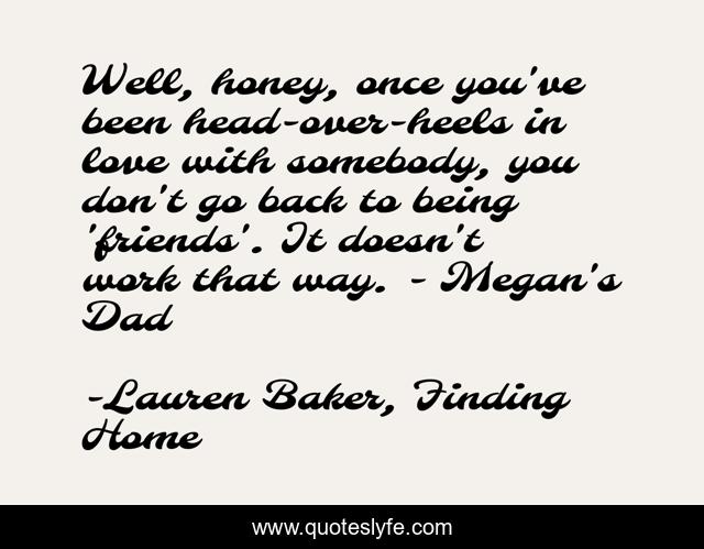 This page presents the quote "Well, honey, once you've been head-over-heels in love with somebody, you don't go back to being 'friends'. It doesn't work that way. - Megan's Dad". Author of this quote is Lauren Baker, Finding Home. This quote is about relationships, love, sweet, family-talk, friendship, affection,.