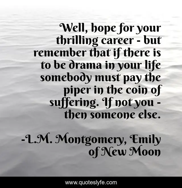 This page presents the quote "Well, hope for your thrilling career - but remember that if there is to be drama in your life somebody must pay the piper in the coin of suffering. If not you - then someone else.". Author of this quote is L.M. Montgomery, Emily of New Moon. This quote is about drama, interesting-life, suffering, melodrama,.