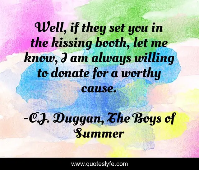 This page presents the quote "Well, if they set you in the kissing booth, let me know, I am always willing to donate for a worthy cause.". Author of this quote is C.J. Duggan, The Boys of Summer. This quote is about romance, boys, young-adult, summer,.