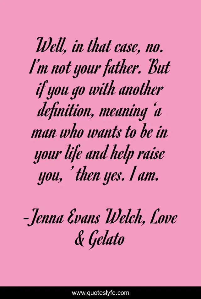 This page presents the quote "Well, in that case, no. I’m not your father. But if you go with another definition, meaning ‘a man who wants to be in your life and help raise you, ’ then yes. I am.". Author of this quote is Jenna Evans Welch, Love & Gelato. This quote is about father, ya-novel, love, affection, summer-read,.