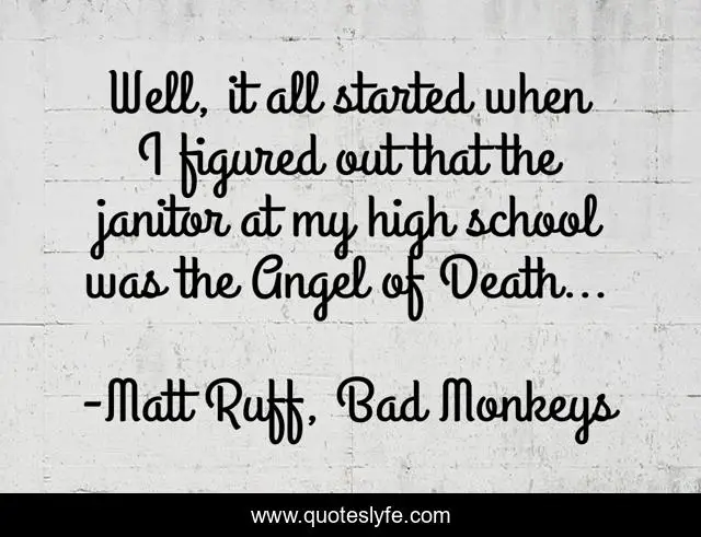 This page presents the quote "Well, it all started when I figured out that the janitor at my high school was the Angel of Death…". Author of this quote is Matt Ruff, Bad Monkeys. .