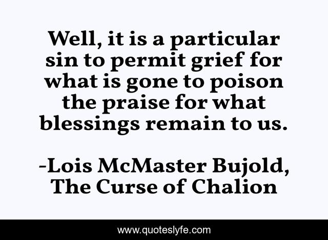 This page presents the quote "Well, it is a particular sin to permit grief for what is gone to poison the praise for what blessings remain to us.". Author of this quote is Lois McMaster Bujold, The Curse of Chalion. .