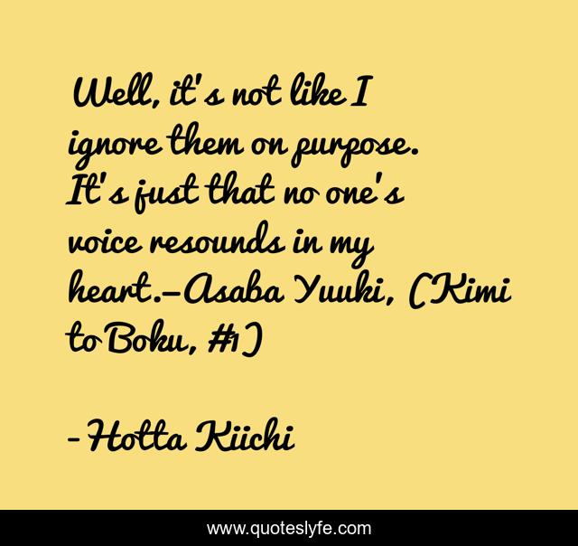 This page presents the quote "Well, it's not like I ignore them on purpose. It's just that no one's voice resounds in my heart.—Asaba Yuuki, (Kimi to Boku, #1)". Author of this quote is Hotta Kiichi 堀田 きいち. This quote is about hotta-kiichi, quote, kimi-to-boku, asaba-yuuki, manga,.