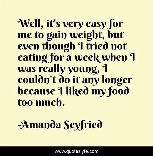 This page presents the quote "Well, it's very easy for me to gain weight, but even though I tried not eating for a week when I was really young, I couldn't do it any longer because I liked my food too much.". Author of this quote is Amanda Seyfried. This quote is about week, me, easy,.