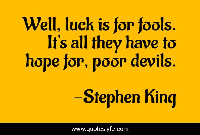 This page presents the quote "Well, luck is for fools. It's all they have to hope for, poor devils.". Author of this quote is Stephen King. This quote is about fool, luck,.