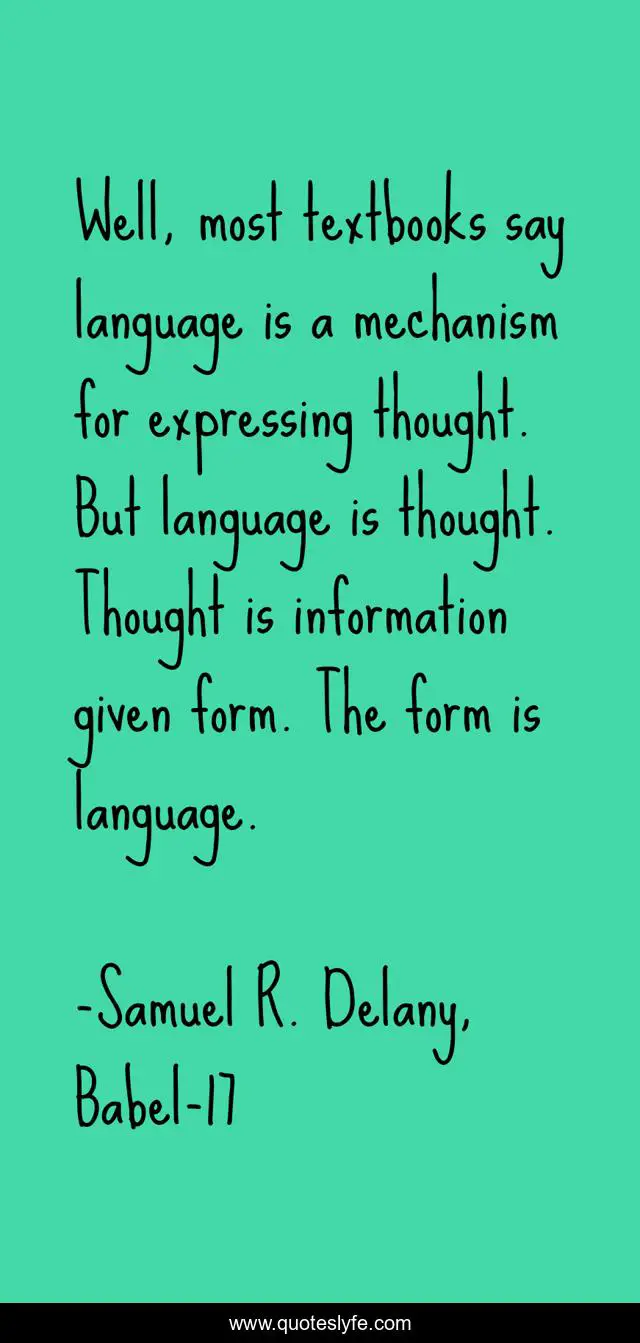 This page presents the quote "Well, most textbooks say language is a mechanism for expressing thought. But language is thought. Thought is information given form. The form is language.". Author of this quote is Samuel R. Delany, Babel-17. .