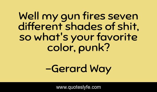 This page presents the quote "Well my gun fires seven different shades of shit, so what's your favorite color, punk?". Author of this quote is Gerard Way. This quote is about love, fire, my-chemical-romance, hate, my-way-home-is-through-you, affection,.