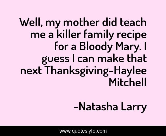 This page presents the quote "Well, my mother did teach me a killer family recipe for a Bloody Mary. I guess I can make that next Thanksgiving-Haylee Mitchell". Author of this quote is Natasha Larry. This quote is about darwin-s-children-series, book,.