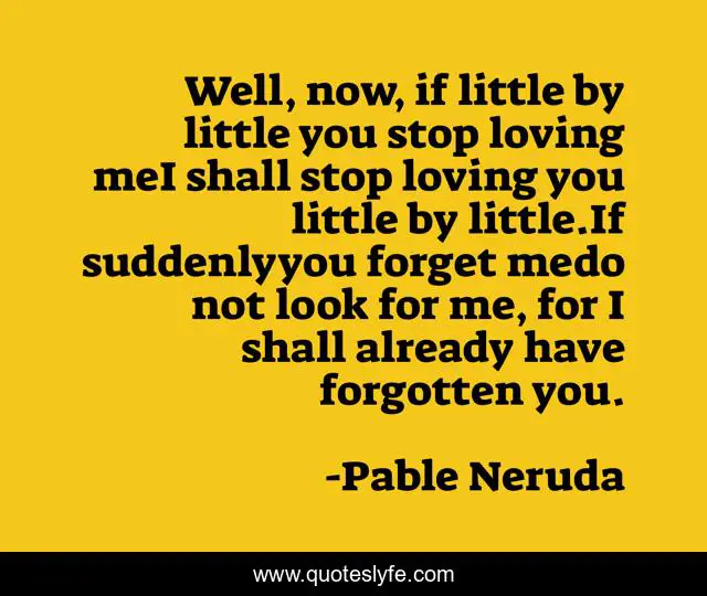 This page presents the quote "Well, now, if little by little you stop loving meI shall stop loving you little by little.If suddenlyyou forget medo not look for me, for I shall already have forgotten you.". Author of this quote is Pable Neruda. This quote is about love, poetry, affection, spanish,.