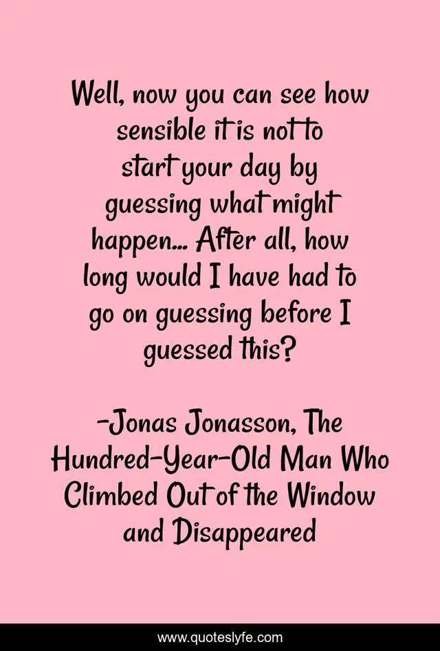 This page presents the quote "Well, now you can see how sensible it is not to start your day by guessing what might happen... After all, how long would I have had to go on guessing before I guessed this?". Author of this quote is Jonas Jonasson, The Hundred-Year-Old Man Who Climbed Out of the Window and Disappeared. This quote is about enthusiasm, humour, inspirational,.