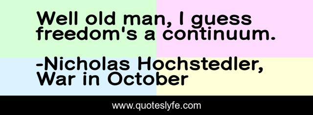 This page presents the quote "Well old man, I guess freedom's a continuum.". Author of this quote is Nicholas Hochstedler, War in October. This quote is about continuum, nicholas-hochstedler, philosophy, war-in-october, book, freedom,.
